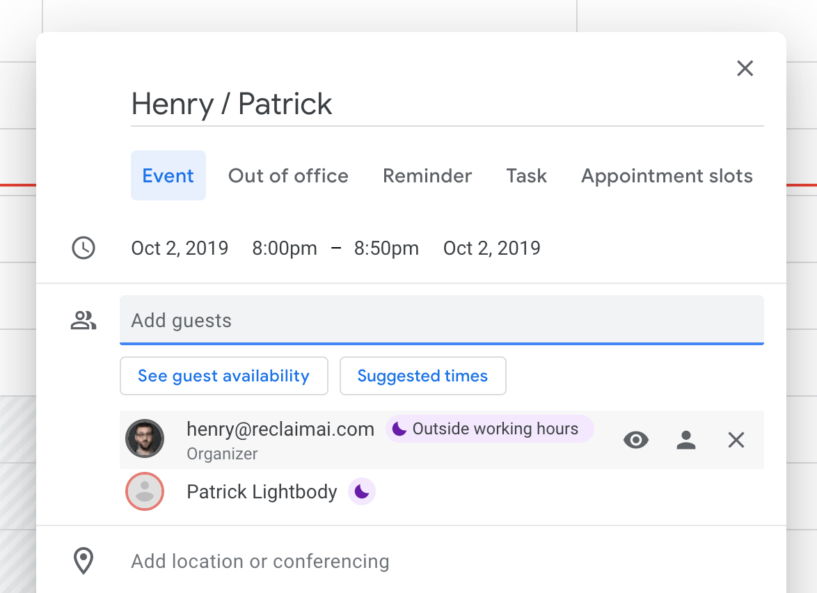 - Warning note for event creators: If you try to schedule an event outside the working hours of one more or guests, you’ll now see an “Outside working hours” notification