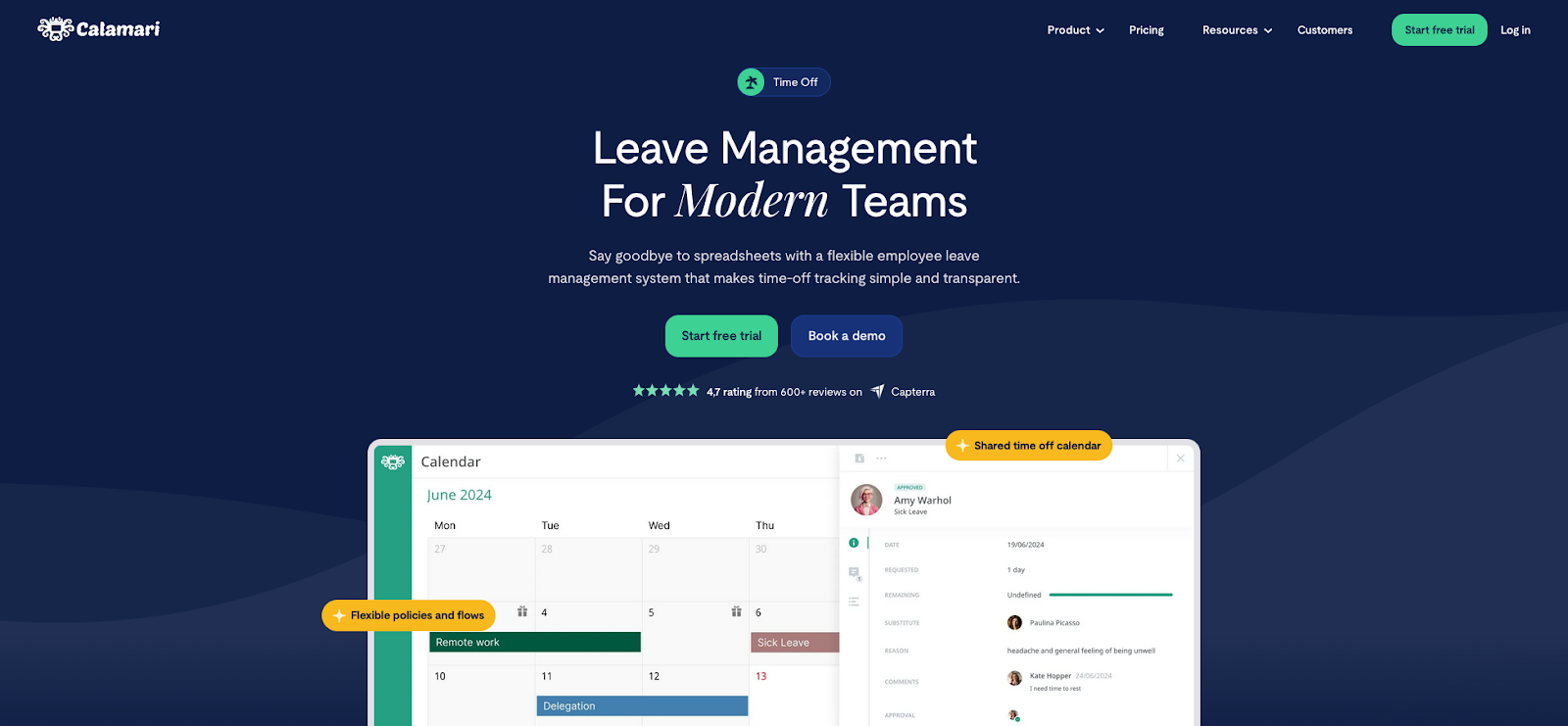 Calamari is a leave management system built for distributed teams operating across multiple countries and time zones. It provides a shared time-off calendar with all absence types in one view, support for 110+ public holiday calendars, and multi-country leave policies. For companies where "who's out" is complicated by regional holidays, local labor laws, and different leave entitlements, it's the strongest option on this list.